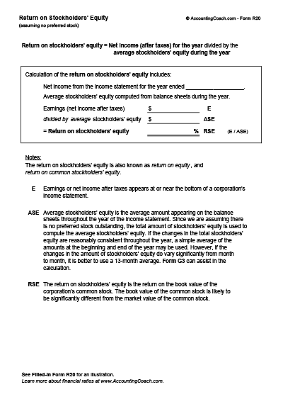 Computing the return on stockholders' equity is easy with this form. Learn where to find the amounts and then enter them on the lines provided. Get familiar with two of the main financial statements as you learn about this popular ratio.